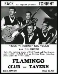 Young formed the Squires in 1963, and the group played at community clubs, high school dances and proms in Winnipeg with Young on electric guitar.[1][2] They played a lot of songs by The Shadows, The Ventures, and The Fireballs.