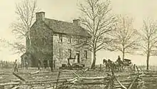 Throughout the rest of the day, the Stone House was constantly under fire as the battle raged on nearby, with some projectiles entering the house and supposedly further wounding a few soldiers. Two flags were placed in the windows of the house to identify it as a hospital, but this did not slow down the fire that constantly peppered the structure. The well outside the Stone House served as a continuous comfort to soldiers on both sides as the fight wore on. As the Union line crumbled toward the end of the battle and the Northern Army found itself retreating from the area, the house came under Confederate control once again, and continued to serve as a hospital throughout the rest of the afternoon. After Confederate forces recaptured the house, they found a large number of wounded Union troops, some dead, and 36 men who surrendered as prisoners. Around 100 arms were also found in the house.[5]