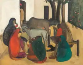 Between 1935 and 1941, Sher-Gil painted mainly in India, where she travelled to exhibit and sell her paintings.[7] She painted in Simla, where her parents lived, in Saraya, Gorakhpur, where her family owned a sugar factory, and in Amritsar and Lahore.[7] Following her 1937 tour of South India which included a visit to the Ajanta Caves, she produced a more classical art style with her South Indian trilogy of paintings Bride's Toilet, Brahmacharis, and South Indian Villagers Going to Market.[7][8] She became popular, though she felt her work was largely misunderstood.[9] The paintings reveal her sense of color and empathy for her Indian subjects, who are often depicted in their poverty and despair.[9] Criticised for portraying a dark side of India, she was simultaneously praised for bringing to the forefront the issue of women and poverty.[9] The trilogy had tired her out and her next set of paintings, including The Story Teller, would be smaller.[10]