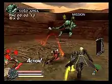 The game also features a "tension gauge" on the right side of the screen. This gauge indicates the player's performance level with combos. The gauge increases when aerial combos are chained and decreases as the player's momentum falls. When the gauge is full, the player will have the ability to perform a powerful "deathblow" attack, combining the party's force to deal extensive damage to the enemies. The level of the gauge increases as the game proceeds, allowing the player to use more powerful attacks. At its highest level, a filled gauge displays the text "Over Zenith," signifying that the strongest deathblow can be performed.
