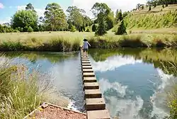 ![]() Small boy crossing a weir in the Tasmanian Arboretum | |