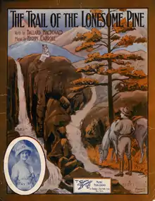 "The Trail of the Lonesome Pine" is a popular song published in 1913, with lyrics by Ballard MacDonald and music by Harry Carroll. It was inspired by John Fox Jr.'s 1908 novel of the same title, but whereas the novel was set in the Cumberland Mountains of Kentucky, the song refers to the Blue Ridge Mountains of Virginia. In it, the singer expresses his love for his girl, June, who is waiting for him under the titular pine tree.[1] It is perhaps best known for being performed by Laurel and Hardy in the 1937 film Way Out West. This version became a UK Singles Chart hit in 1975, some years after both actors had died.[2]