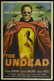 The Undead is a 1957 horror film directed by Roger Corman and starring Pamela Duncan, Allison Hayes, Richard Garland and Val Dufour. It also featured Corman regulars Richard Devon, Dick Miller, Mel Welles and Bruno VeSota. The authors' original working title was The Trance of Diana Love. The film follows the story of a prostitute, Diana Love (Duncan), who is put into a hypnotic trance by psychic Quintus (Dufour), thus causing her to regress to a previous life. Hayes later starred in Attack of the 50 Foot Woman (1958). The film was released on March 15, 1957 by American International Pictures as a double feature with Voodoo Woman.