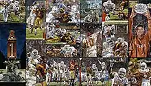 Some figures from past Texas seasons are also included in the background, such as James Street handing off to Billy Dale which was a famous play from the 1969 championship.[2] Darrell Royal's face appears as a shadow behind the image of Mack Brown holding aloft the championship trophy.