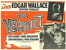 The Verdict is a 1964 British mystery thriller film directed by David Eady and starring Cec Linder, Zena Marshall and Nigel Davenport.[1] Part of the Edgar Wallace Mysteries film series made at Merton Park Studios, the film's sets were designed by the art director Peter Mullins.