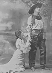 The earliest known production of The Virginian was at Boston's Majestic Theatre in October 1903.[2] The Boston booking was apparently intended as a dry run before taking the play to Broadway. It opened on Broadway in New York at the Manhattan Theatre on January 5, 1904, and ran until May 1904. Most of the actors who appeared in Boston were also in the Broadway production a few months later. The lead was played by Dustin Farnum who continued the role in New York. Molly Wood, the heroine, was well-acted by Nanette Comstock in Boston, but Agnes Ardeck apparently did a poorer job in New York.[3] Other actors in both plays include Frank Campeau who played "Trampas"; Joseph A. Maylon playing "John Taylor"; and Thomas P. Jackson who played "Andrew Dow/Shorty".[4]
