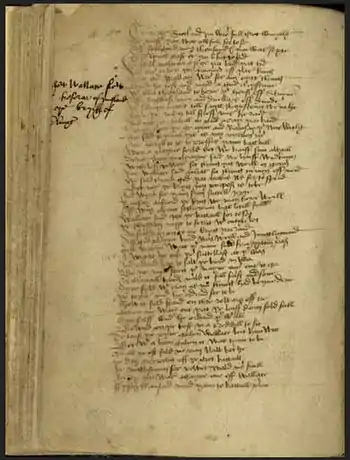 At first, The Wallace circulated only in manuscript form. The earliest surviving manuscript of the poem was written in 1488 by John Ramsay, a Prior of the Perth Charterhouse.[14] The Ramsay manuscript is preserved in the National Library of Scotland under the catalogue number Adv. MS. 19.2.2 (ii).[14]