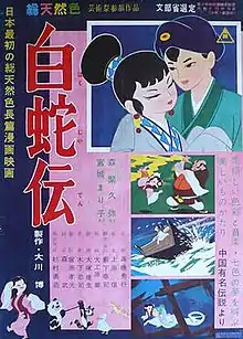 The White Snake Enchantress (白蛇伝, Hakujaden, Legend of the White Serpent) is a Japanese animated fantasy film. It is the first color anime feature film and Toei Animation's first theatrical feature film, released in 1958. It was one of the first three anime films to be released in America, under the title Panda and the Magic Serpent, premiering in 1961, the month after Magic Boy.[1] It is also known variously as The Great White Snake and The Tale of the White Serpent. In April 2019, a restored version of the film was selected to be shown in the Cannes Classics section at the 2019 Cannes Film Festival.[2]