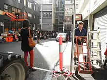 On October 8, 2012, production returned to Sydney with filming on Erskine Street near Cockle Bay.[74] The following week, the film shot in Parramatta, which doubled as a Japanese city.[75] Also in October, Mangold revealed that the film follows the events of X-Men: The Last Stand, saying, "Where this film sits in the universe of the films is after them all. Jean Grey is gone, most of the X-Men are disbanded or gone, so there's a tremendous sense of isolation for [Wolverine]".[76] He elaborated that his decision to have The Wolverine take place after The Last Stand without making it a direct sequel to that film stemmed from the simplicity of setting the story after the huge amount of adventures Wolverine has endured throughout the film series the possibility of choosing a perfect moment for Logan to be stripped of both his heroic duties and his sense of purpose like a rōnin due to several of his fellow X-Men dying in the third X-Men film, allowing him to live in a "separate" world that doesn't necessarily need to tie-in with the next film to allow for more creative freedom, and finding himself in an existential crisis due to his immortality, which Mangold felt that it sounded in accordance to the themes of the original arc by Claremont and Miller.[77] Mangold later stated that in the fight scenes, "there's an urgency and a kind of intensity and hand to hand physicality that I hope is a little different than everything else out there".[24] On October 25, 2012 production relocated to Sydney Olympic Park in western Sydney.[78] The set was made into a Japanese village draped in snow with filming beginning on November 1, 2012.[79] On November 10, 2012, filming took place on a back street in Surry Hills. The set, constructed on Brisbane St., was transformed to look like a Japanese street with Japanese signage and vehicles scattered throughout.[80] Principal photography concluded on November 21, 2012.[81]