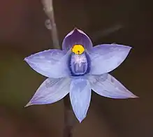 Thelymitra malvina, commonly called the mauve-tufted sun orchid,[2] is a species of orchid that is native to eastern Australia and New Zealand. It has a single large, fleshy leaf and up to twenty five blue to mauve flowers with pink or mauve tufts on top of the anther.