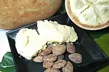 Cupuaçu butter is a triglyceride composed of saturated and unsaturated fatty acids, giving the butter a low melting point (approximately 30 °C) and texture of a soft solid, lending its use as a confectionery resembling white chocolate.[2] Main fatty acid components of cupuaçu butter are stearic acid (38%), oleic acid (38%), palmitic acid (11%) and arachidic acid (7%).[22][20]