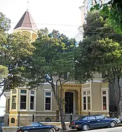 The Theodore Payne House was designed by William Curlett and his brother-in-law Theodore Eisen[1][2] in a blended Victorian style, with Stick, Eastlake, and Queen Anne elements.[3] It is the last of several mansions along its section of Sutter Street, and one of the few surviving upper-class houses from before the 1906 earthquake and the ensuing fire.[3] It was built with modern conveniences including heating, hot and cold running water, and indoor toilets,[1][3][4] and had a porte cochère (now removed), many bay windows, and an open octagonal candle-snuffer turret.[1][2] The interiors include Tiffany stained-glass windows.[5]