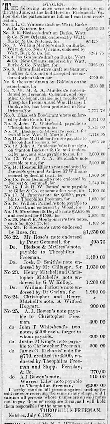 - ↑ "Theophilus Freeman, a celebrated negro-trader..." Mississippi Free Trader. 1852-06-16. p. 2. Retrieved 2023-09-05.