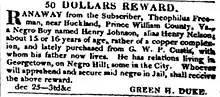 Theophilus Freeman appears in the 1830 census of Prince William County, Virginia—which is just outside the District of Columbia in northern Virginia—with one enslaved man in his household.[4] There was a letter waiting for Theophilus Freeman at the Monticello, Georgia post office in 1831.[5] There was a letter waiting for Freeman at the Augusta, Georgia post office in 1832.[6] In the 1830s, Freeman seems to have been a partner with N. C. Finnall in the trading firm Finnall & Freeman, which exported slaves from the Virginia area to New Orleans for sale.[7] In December 1833, he placed a runaway slave ad in the Washington Intelligencer looking to recover a teenager named Henry Johnson whom he had recently purchased from George Washington Parke Custis (step-grandson of George Washington and father-in-law of Robert E. Lee).[8] Frederic Bancroft found that Freeman was one of the consignees whose name appeared most frequently in records of the coastwise slave trade for 1834–1835.[9] It is through a newspaper ad placed during the period of Freeman's partnership with Benjamin Eaton[10] at the Forks of the Road slave market in Natchez, Mississippi that we know that an early name for that place was Niggerville,[11] "which meant Slaveville, but was more contemptuous."[12] Eaton and Freeman may have remained in partnership until the 1840s.[13]