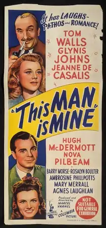 This Man Is Mine is a 1946 British comedy film directed by Marcel Varnel and starring Tom Walls, Glynis Johns and Jeanne De Casalis.[1] The screenplay concerns a Canadian soldier who is billeted with a British family for the Christmas holidays. It was based on the hit West End play A Soldier for Christmas by Reginald Beckwith.[2] The film was shot at Pinewood Studios with sets designed by the art director George Provis. It was the final film of French director Varnel, known for his many comedies featuring music hall stars including Will Hay and George Formby, who died in a car accident following the shooting of the film.