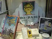 In order to launch his company, Alexis Moussalli also associated with Secor (Société d'exportation, commission, représentation), a French-American corporation, which was to field Tho-Radia products on the market. The brand was officially launched in 1932 for Paris and in 1933 for the rest of France.[2] Tho-Radia creams got noticed through their recognisable advertising, designed by publicist Tony Burnand, depicting a young, blond woman lit from below by visible rays. This image, which became associated with the brand in the public consciousness, would serve into the 1950s.[1] The success of Tho-Radia creams allowed Alexis Moussalli to start selling powder, toothpaste and soap, although the two later were sold as containing only thorium.[2]
