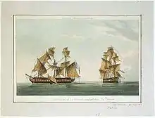 He spent between 1796 and 1797 in the North Sea, after which he was appointed flag captain aboard the 98-gun HMS Princess Royal, the flagship of Sir John Orde.[1][4] On 12 July he was appointed to command the 28-gun HMS Nemesis, serving in the Downs under Vice-Admiral Joseph Peyton.[1][5] He was active against French privateers while in command of Nemesis, capturing the 14-gun Renard in the Channel on 12 January 1800, followed by the Modéré some time later.[5] The Nemesis's boats participated in a fireship attack on the French frigates in the Dunkirk Roads on 7 July 1800, but an event of international significance occurred on 25 July 1800.[5]