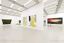 Reinhold’s large-scale oil paintings address such issues as medium reflexivity, the material dimension of paint, or the canvas plane and its relation to space. The paintings deal with questions of their own creation and their relation to time by showing overlapping layers of colour.[4] Because of this, the beholder needs to see the paintings in an almost archaeological way to explore the pictorial space. In 2011, Reinhold worked on the series “Tectonics of Poise“. The subject of this group of works reflects on their own creation. Liquid paint coalesces around a dead centre, permitting – for a few moments – a process of ordered decision making. The painting procedure, in which the allocation of the centre of gravity is such an essential element, actually provokes this fleeting state where indeterminacy gives way to form. It is this point of transition that attracts attention and produces shapes seemingly suspended between rivulets.