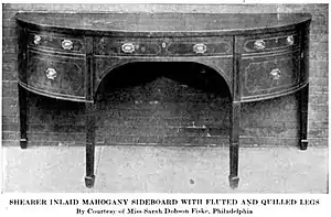 In Shearer's time the sideboard was in process of evolution; previously it had been a table with drawers, the pedestals and knife-boxes being separate pieces. He would seem to have been first to combine them into the familiar and often beautiful form they took at the end of the 18th century. The combination may have been made before, but his plate seemed to have been the first published document to show it.[2]