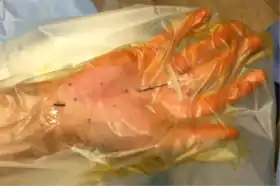 ![]() Under the guidance of ultrasound, the routing needle makes a loop with a piece of cutting thread about the transverse carpal ligament in two needle passes.  |
