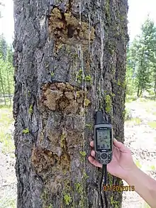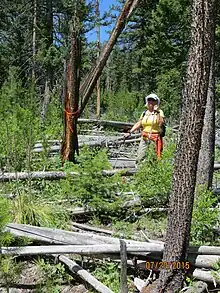 Three blazes were used, which was different than the common two blaze system used by the U.S. Forest Service. The two-blaze system consisted of a lower 8 inch-long dash with an upper short dot above as explained in "Trail Construction of the National Forests", U.S. Department of Agriculture, Washington Government Printing Office, 1915.[11] The two blaze dot and dash was the more common method to blaze trees as used by the U.S. Forest Service to mark trails until discontinued in the 1980s. The Three Blaze Trail is now part of the National Forest Service Trail System, part of which are numbered Trails 017 and 006, on the Payette National Forest. The trail is no longer maintained as demonstrated by the photo showing the trail clogged with downed timber.