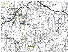 The route from Copper Camp on Big Creek to the Thunder Mountain Mining area continued to follow an existing trail down Big Creek, from near the mouth of Copper Creek, downstream about 4 miles to Monumental Creek, then up-stream on Monumental Creek about 20 miles to the Thunder Mountain Mining area, and Roosevelt, Idaho.[13] The total length of the route from Dixie, Idaho, to the Thunder Mountain Mining Area is 85 miles, as shown on Peter Preston's Three Blaze Trail vicinity map.