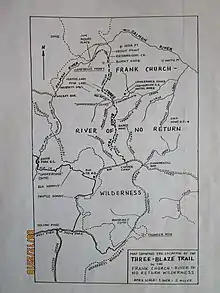 The Three Blaze Trail is an Historic Trail constructed in 1902 in Idaho, United States.[1][2] The trail was located and constructed by William Stonebreaker, William Campbell, Harry Donohue, and August Hotzel as a "shortcut" route from Dixie, Idaho, to the Thunder Mountain mining area in central Idaho.[3] The Three Blaze Trail and the Thunder Mountain mining district lie within the Frank Church-River of No Return Wilderness. While there were already at least four existing routes into Thunder Mountain,[4] the local miners and business men of the area raised $3,000 and contracted the four builders to locate and construct the shorter route.