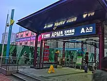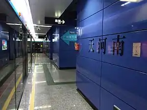 Tianhenan Station (Chinese: 天河南站; pinyin: Tiānhénán Zhàn; Jyutping: tin1ho4naam4 zaam6), formerly Tianhe 1st Road South Station (天河南一路站) during planning, is a metro station on the Guangzhou Metro APM line. It is located under the interchange of Tianhe 1st South Road (天河南一路) and Liuyun 2nd Street (六运二街) in the Tianhe District.[1] It started operation on 8 November 2010.[2][3] The station is unique in being the only station in Guangzhou with no escalator access to the platforms - instead 4 lifts carry passengers from the concourse to the platform although there is a staircase for emergency use.