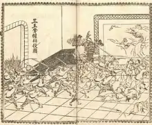 Shortly before seeking a title commensurate with Hong Xiuquan's, Yang dispatched Wei Changhui, Shi Dakai, and Qin Rigang to separate provinces.[7] Hong, viewing Yang's request as treasonous, alerted the three generals to return at once.[7] Wei returned to Nanjing with three thousand troops on September 1, 1856, and found that Qin Rigang had already arrived.[8] In consultation with Hong Xiuquan and his allies, the two generals decided not to wait for Shi Dakai's arrival.[8] Instead, they and their troops immediately stormed Yang's palace and slew him before he could escape.[8] They then slaughtered his family and followers within the palace, despite having agreed with Hong that only Yang was to die.[8] At this point, six thousand of Yang's followers remained in Nanjing.[9] Hong and his generals agreed to set a trap for those men.[10] Hong pretended to arrest Wei and Qin Rigang for their actions and invited Yang's followers to watch as the two were beaten.[10] Once the majority of Yang's followers were inside, the beatings ceased and Yang's followers were imprisoned inside the halls from which they were watching the beatings.[10] The next morning, they were all systemically slaughtered.[11] Killings of Yang's followers continued for three additional months.[12]