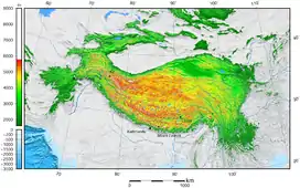 The Tibetan Plateau (Tibetan: བོད་ས་མཐོ།, Wylie: bod sa mtho), also known as the Qinghai–Tibet Plateau[1] or the Qing–Zang Plateau[2] (Chinese: 青藏高原; pinyin: Qīng–Zàng Gāoyuán) or as the Himalayan Plateau in India,[3][4] is a vast elevated plateau located at the intersection of Central, South, and East Asia[5][6][7][8][9][10][11][12] covering most of the Tibet Autonomous Region, most of Qinghai, western half of Sichuan, Southern Gansu provinces in Western China, southern Xinjiang, Bhutan, the Indian regions of Ladakh and Lahaul and Spiti (Himachal Pradesh) as well as Gilgit-Baltistan in Pakistan, northwestern Nepal, eastern Tajikistan and southern Kyrgyzstan. It stretches approximately 1,000 kilometres (620 mi) north to south and 2,500 kilometres (1,600 mi) east to west. It is the world's highest and largest plateau above sea level, with an area of 2,500,000 square kilometres (970,000 sq mi) (about five times the size of Metropolitan France).[13] With an average elevation exceeding 4,500 metres (14,800 ft) and being surrounded by imposing mountain ranges that harbor the world's two highest summits, Mount Everest and K2, the Tibetan Plateau is often referred to as "the Roof of the World".