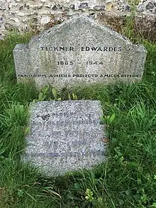 His grave at the church of St Mary in Burpham. The Latin text is Santorum amicus profecto amicos reperiet, "a friend of the saints shall surely find friends."