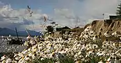 The Beagle Channel or strait in Tierra del Fuego National Park is named after the British ship HMS Beagle, which sailed with the naturalist Charles Darwin aboard in 1833–34.[18] The channel separates islands of the Tierra del Fuego Archipelago, in extreme southern South America. It separates Isla Grande de Tierra del Fuego from the islands of Nueva, Picton, Navarino, Hoste, Londonderry, Stewart, and other smaller islands to the south. It is oriented in an east-west direction, and runs for a length of 150 mi (240 km). Its width varies from 3 to 8 mi (4.8 to 12.9 km). The biggest settlement on the channel is Ushuaia in Argentina followed by Puerto Williams in Chile, two of the southernmost settlements in the world.[19][20] Ancient middens where Yaghan tribes lived are seen on the beaches around the Beagle Channel.[4]