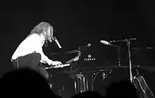 He draws on his background in theatre for his distinctive onstage appearance and persona.[9] In his performances, he typically goes barefoot with wild hair and heavy eye makeup, which is juxtaposed with a crisp suit and tails, and a grand piano. According to Minchin, he likes going barefoot in his shows because it makes him feel more comfortable. He considers the eye makeup important because while he is playing the piano he is not able to use his arms and relies on his face for expressions and gestures; the eyeliner makes his features more distinguishable for the audience.[11] He has said that much of his look and persona is about "treading that line between mocking yourself and wanting to be an iconic figure. Mocking the ridiculousness and completely unrealistic dream of being an iconic figure."[15]