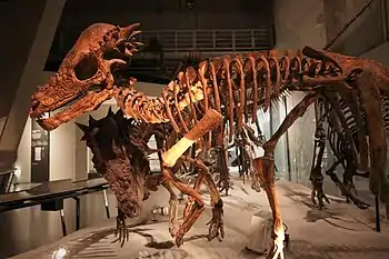 In 1924, Charles Whitney Gilmore named the family Troodontidae after Troodon, but most of its members would be recognizable today as pachycephalosaurs.[2] Seven years later, Gilmore named the new species "Troodon" wyomingensis which would be formally reclassified as Pachycephalosaurus in 1943. Pachycephalosaurus was so unusual that Sternberg named a new family for it, the Pachycephalosauridae.[3] From the time paleontologists identified the pachycephalosaurs as a distinct group of dinosaurs, the chief mystery surrounding their biology has been the function of their distinctive cranial domes. Edwin Colbert interpreted the structure as a biological battering ram in 1955, but never specified who or what may have been on its receiving end. The idea that it was used in head butting between members of the same pachycephalosaur species was first proposed by science fiction writer Sprague de Camp. From then it became a staple of both scientific and cultural reconstructions of these animals.[4]