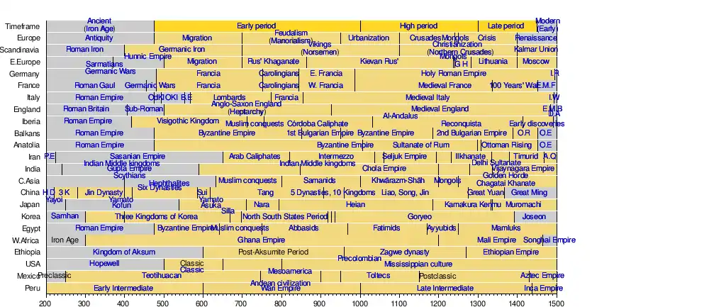 This timetable gives a basic overview of states, cultures and events which transpired roughly between the years 200 and 1500. Sections are broken by political and geographic location.[1][2]