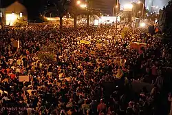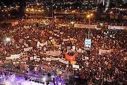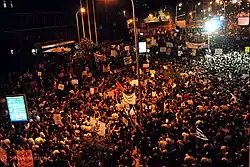 On 30 July, between 85,000 (police estimation) and 150,000 people (organizers estimation) took part in demonstrations in the streets against the social policies of the Netanyahu government, chanting slogans denouncing the government and calling for social justice. Demonstrations were held in Jerusalem, Tel Aviv, Haifa, Beersheba, Kfar Saba, Ra'anana, Baqa al-Gharbiya, Ashdod, Nazareth, Kiryat Shmona, Modi'in-Maccabim-Re'ut, Kfar Saba, Netanya, Ashkelon, Tiberias, the Savion Junction, and the Jordan Valley. Police sources said that in all, about 150,000 people took part in the protests. In Tel Aviv alone, about 80,000 participated in the demonstration,[29] which was so large that hundreds of police officers, including the sector commander, were deployed to secure it.[30] Some 10,000 demonstrators participated in Jerusalem and 12,000 in Haifa.[31][32]