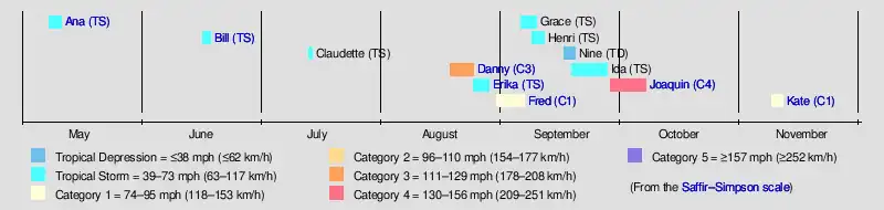 Hurricane Kate (2015)Hurricane JoaquinHurricane Fred (2015)Tropical Storm ErikaHurricane Danny (2015)Tropical Storm Bill (2015)Tropical Storm Ana (2015)Saffir–Simpson scale