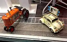 Tinplate was used in the manufacture of toys beginning in the mid-19th century. The invention of sheet metal stamping machines in 1815 allowed for the mass production of inexpensive toys. Tin toys were made from thin sheets of steel plated with tin, hence the name tinplate.[2] Tin toys were a cheap and durable substitute for wooden toys. The toys were originally assembled and painted by hand. Spring-activated tin toys originated in Germany in the 1850s.[3] In the late 1880s offset lithography was used to print designs on tinplate. After the colorful designs were printed on the metal, they were formed by dies and assembled with small tabs. The lightweight nature of the toys allowed them to be shipped less expensively and easier than the heavier cast iron toys.