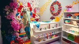 A screenshot from the music video, depicting Alejandro mopping the floor in a colorful room full of flowers, emoji cushions, and rainbows.