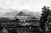 Tivoli Park was laid out upon the plans by the engineer Jean Blanchard in 1813, when Ljubljana was the capital of the French Illyrian Provinces. He joined two existing parks, around Tivoli Castle (at that time called Podturn Manor) and around Cekin Mansion, and linked them to the Ljubljana downtown.[38] The park was named in the second half of the 19th century after a summer residence of the Casino Society with an amusement park, a pub and a cafe, which was opened in 1835 next to Podturn Manor.[39][40]