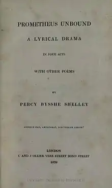 "To a Skylark" is a poem completed by Percy Bysshe Shelley in late June 1820 and published accompanying his lyrical drama Prometheus Unbound by Charles and James Ollier in London.[1]