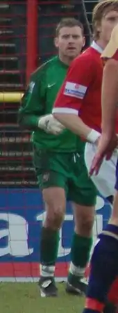 He was released by Scunthorpe in May 2006 and joined Conference National club York City on 31 July after making a good impression on manager Billy McEwan during several weeks on trial.[6][7] He said that he believed promotion could be achieved for York with 20 clean sheets.[8] He was sent off in the 16th minute of an away match against Crawley Town on 9 September 2006 after fouling Dannie Bulman outside the penalty area, which York lost 3–0 with second choice goalkeeper Arran Reid brought on to replace him.[9] He was offered a new contract by York at the end of 2006–07.[10]
