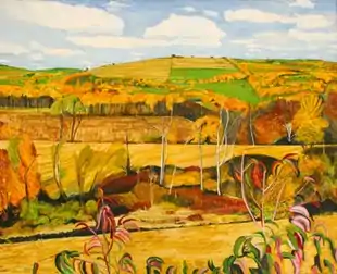 Tom Goldenberg (born 1948) is an American artist, best known for landscape and abstract paintings.[1][2] He has shown throughout the United States and internationally, and his work has been covered by The New York Times,[3] The New Criterion,[4] Art in America,[5] Arts Magazine,[6] Art & Antiques,[7] and The New York Observer,[8] among other publications.[9][10] Critics often note his landscape works for their contemporary interplay of stylization and observation and concern for form over verisimilitude, pointing to his beginnings in abstraction as a foundation that underlies his ordered pictorial structures.[8][11][12][1] In the later 2010s, Goldenberg has returned to abstraction that sometimes suggests interior or "fictive" landscapes.[13][14] The New Criterion editor and writer Roger Kimball described his paintings as leading "double lives, as memorable evocations of rural landscape and tightly organized arrangements of abstract planes of color."[1] Hilton Kramer characterized his work as "deeply mediated by aesthetic reflection" and classical rather than romantic in feeling.[8] Goldenberg and his wife, Michelle Alfandari, have lived in Sharon, Connecticut since 2016, after being based in New York City since the 1970s.[15]