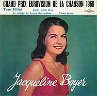 "Tom Pillibi" is a song written in French by Pierre Cour, composed by André Popp and performed in 1960 by Jacqueline Boyer as France's entry and the winner of the Eurovision Song Contest 1960, gaining other versions including covers by other Eurovision entrants and by Hollywood star Julie Andrews. It was released as a single on 10 April 1960.[1]