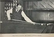 ![]() Tom Reece playing an anchor stroke at English billiards, from his 1928 book "Cannons and Big Guns" | |