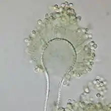 However, microbiologist Bolesław Smyk identified the presence of the fungus Aspergillus flavus in samples taken from the tomb.[12][14] This type of fungus produces toxic substances called aflatoxins which are linked to a number of serious health conditions affecting the liver and are highly carcinogenic.[16] Media reports have suggested that the likely cause of the deaths were the aflatoxins produced by this fungus.[2][12][14] The Times reported that it is thought that the conservation team members had inhaled the toxic spores of the fungus as they opened the tomb.[17]