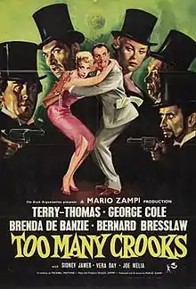 Too Many Crooks is a 1959 British black comedy film directed by Mario Zampi. The plot concerns a bunch of inept crooks who kidnap the wife of a shady businessman, only for him to decide he doesn’t want her back.[1] It stars George Cole, Sidney James and Bernard Bresslaw as members of the gang, alongside Brenda de Banzie as the victim and Terry-Thomas as her husband.[2]