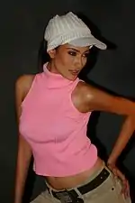 A top is an item of clothing that covers at least the chest, but which usually covers most of the upper human body between the neck and the waistline.[1] The bottom of tops can be as short as mid-torso, or as long as mid-thigh. Men's tops are generally paired with pants, and women's with pants or skirts. Common types of tops are t-shirts, blouses and shirts.