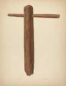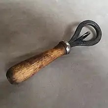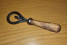 Tops come in a variety of forms for use on different types of rope. The simplest is a forked stick, used to create three strand rope, however more elaborate grooved bullet-shaped and cast iron types are available.[1] Depending on the gauge of rope being made, the top can either be handheld or mounted on a trolley that moves along the ropewalk.