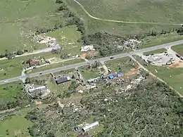 Storm chasers in the region reported multiple funnel clouds and two touchdowns, neither of which resulted in damage. Several tornadoes were confirmed through storm chaser video and local emergency management services. A large, intense tornado later caused severe damage in and around the towns of Atoka and Tushka. Many houses were destroyed or flattened from what was at times a double tornado with two well-defined vortices. Numerous injuries were reported in the latter of these areas.[11] Two died and 43 more were injured in Tushka.[12] In Arkansas, strong winds produced by thunderstorms killed at least seven people.[13][14] Of those deaths, five were confirmed to have been from straight-line winds and two were as a result of a weak tornado embedded in an overnight squall line that tracked across the state.[15]